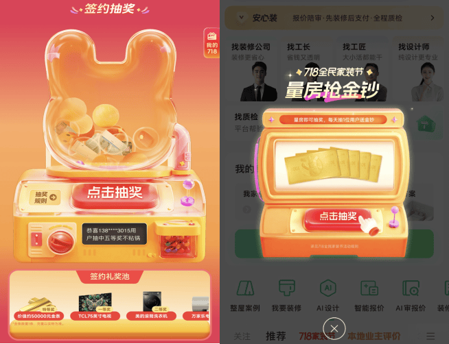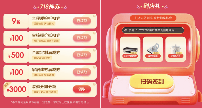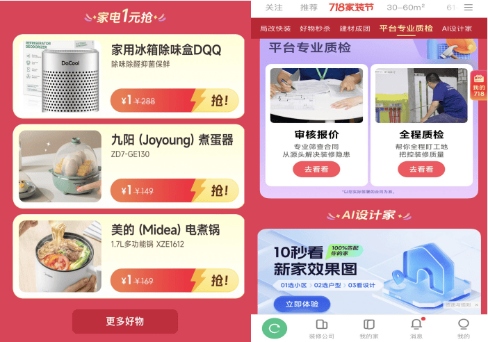 为用户省钱的另一方面,合适前提的用户完成量房,正在“718神券”板块!还能够享遭到爆款价钱团购、家电1元抢,查看更多